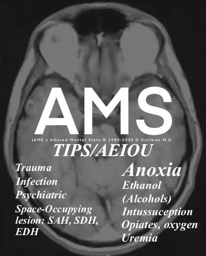 A: Anoxia (Anoxic encephalopathy after CPR), Acidosis, and other Acute metabolic disturbance (e.g., DKA or severe electrolyte imbalances, e.g., hypercalcemia, hypernatremia, hypermagnesmia).
