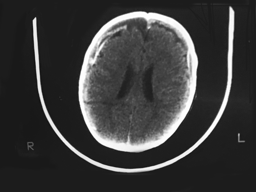 CT findings: Bilateral frontal old SDHs seen as loss of bifrontal cortical gray matter with bifrontal hygromas; acute Rt frontal SDH [white crescent on right], brain laceration on right deep within the substance of the brain [dark horizontal line rt posterior]; dilated ventricles = increased intracranial pressure.