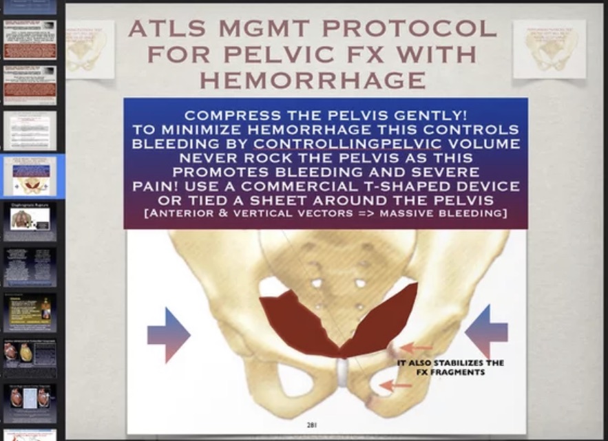 The patient also has abdominal distention, and may have a peritoneal lavage performed after the bladder and stomach are decompressed. This reveals grossly bloody fluid that is aspirated out of the abdominal cavity without lavage being performed. A bedside US FAST study, is grossly positive for free blood and negates the need for DPL if requested first. In addition there is a fracture of the left femur which requires splinting.
